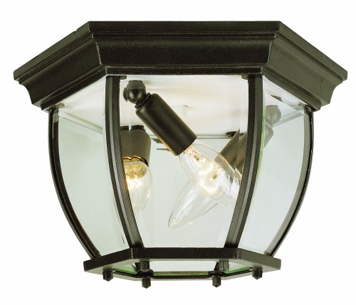 4906 BK Finish: Black, Size: 6.5" H x 11" W Pictured in black gold.This outdoor ceiling fixture allows maximum light to shine through with its clear glass panels. Features: -Flush mount. -Available in: -Black finish. -Black copper finish. -Black gold finish. -Rust finish. -White finish. -Swedish iron finish. -Verde green finish. . -Available in: -11'' Width size. -13'' Width size. . -Cast aluminum construction. -Beveled glass. Specifications: -11'' Flush mount accommodates (3) 60W candelabra base bulbs (not included). -13'' Flush mount accommodates (4) 60W medium base bulbs (not included). -UL listed. -11'' Flush mount dimensions: 6.5'' H x 11'' W. -13'' Flush mount dimensions: 6.5'' H x 13'' W.